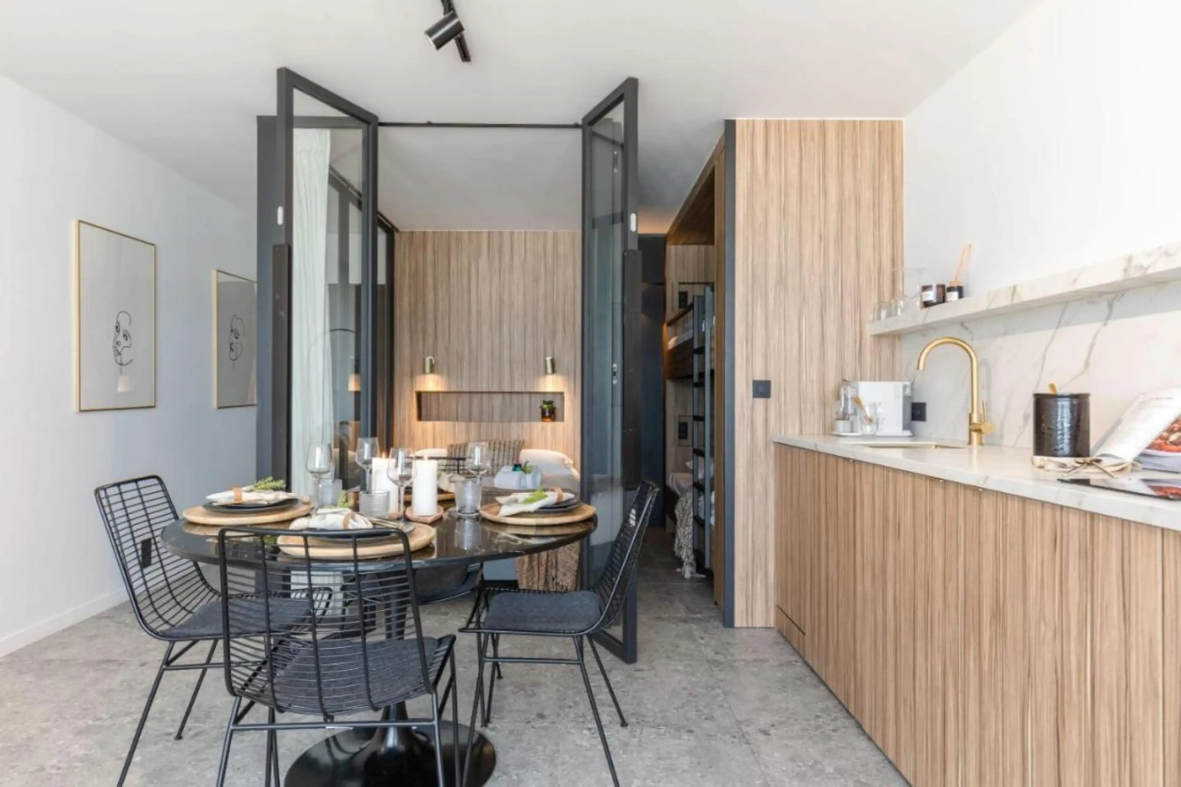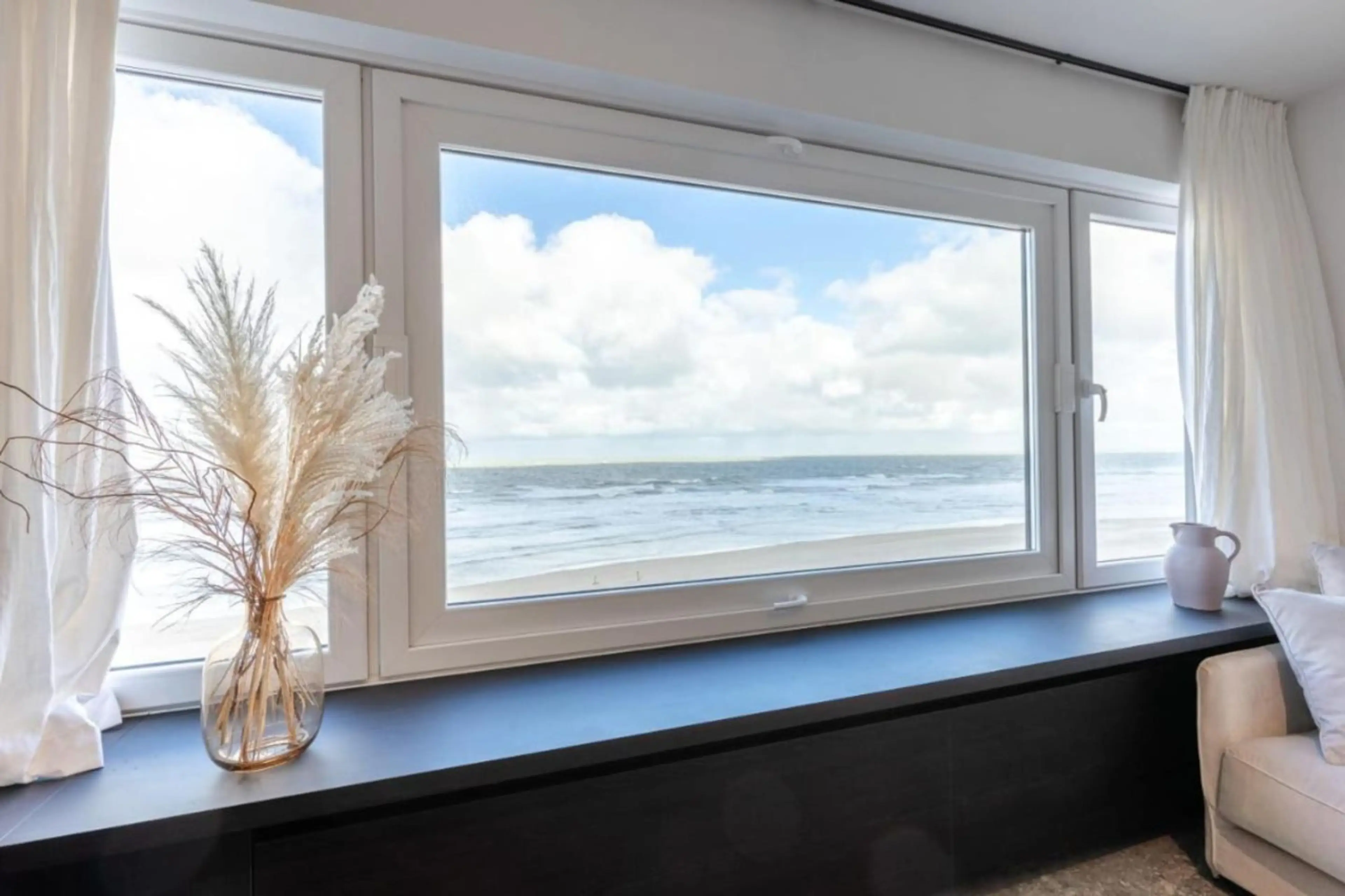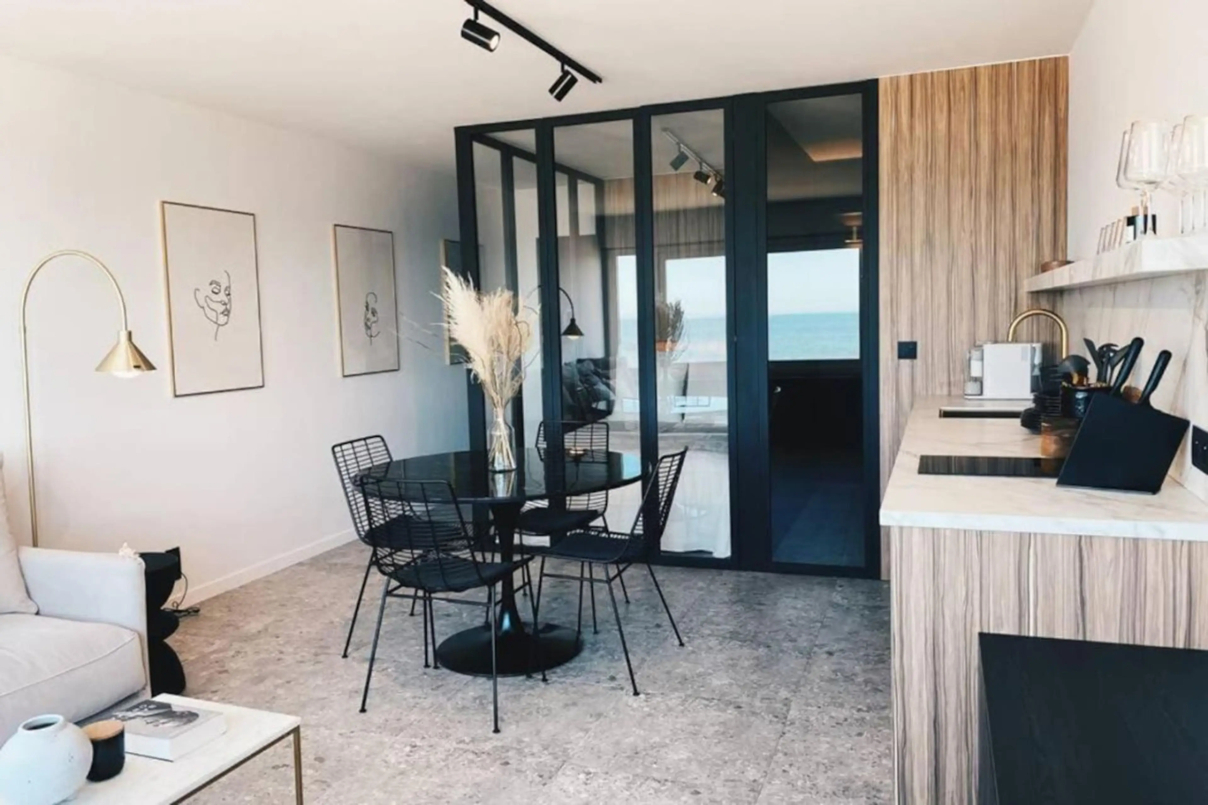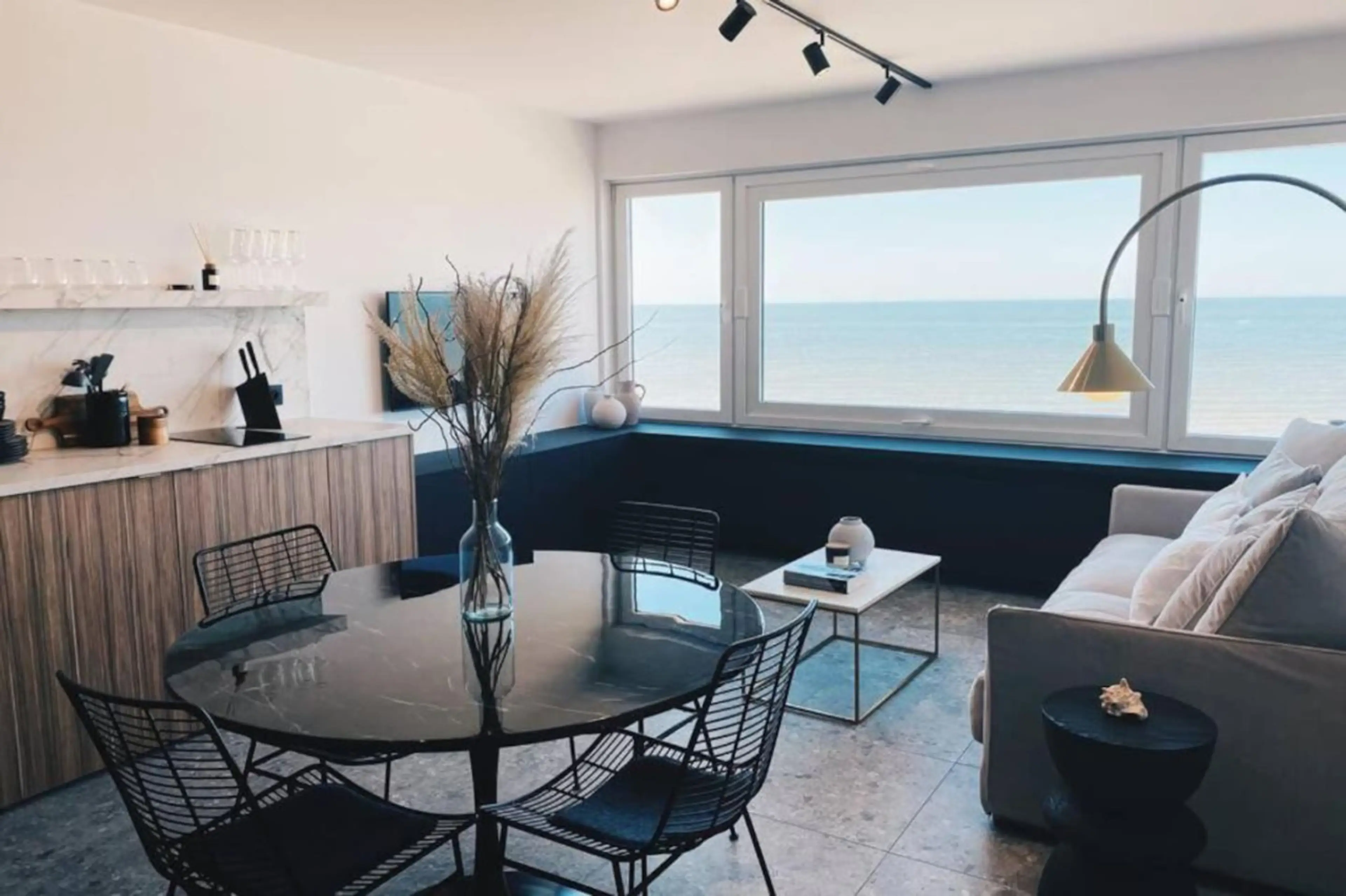 Wonderful 45 sqm architect designed flat with panoramic sea view, located on the Ostend dike. The flat has a spacious open plan living room with fully equipped kitchen, two bedrooms and a superb bathroom. Particular attention has been paid to the choice of materials but also to the home automation (...